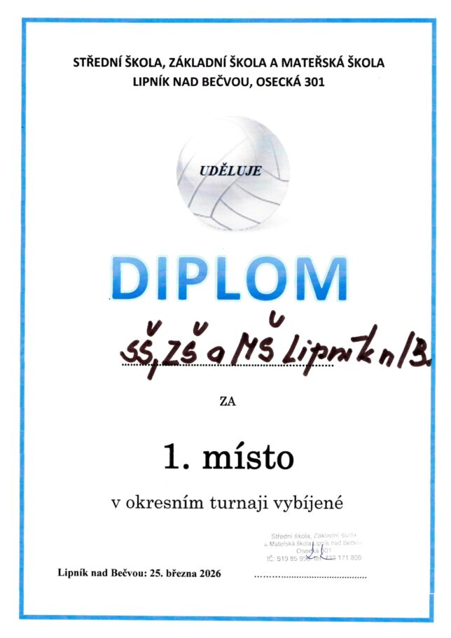 Ve středu 25. března 2026 proběhlo v naší škole okresní kolo tradičního turnaje ve vybíjené. Turnaje se zúčastnily 4 týmy smíšených družstev. Naši školu reprezentovalo družstvo ve složení – Karolína Bartošková, Jesika Gáborová, Nela Siváková, Gabriela Plachá, Lukáš Macko, Karel Haluška a Erik Gábor.